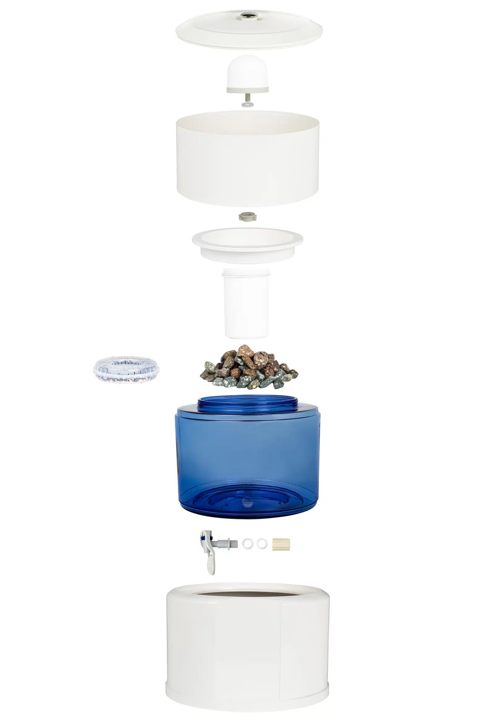 In the upper tank, you pour unfiltered water, which is slowly filtered and then flows into the lower storage tank. Make sure not to add more water than the storage tank’s capacity allows.