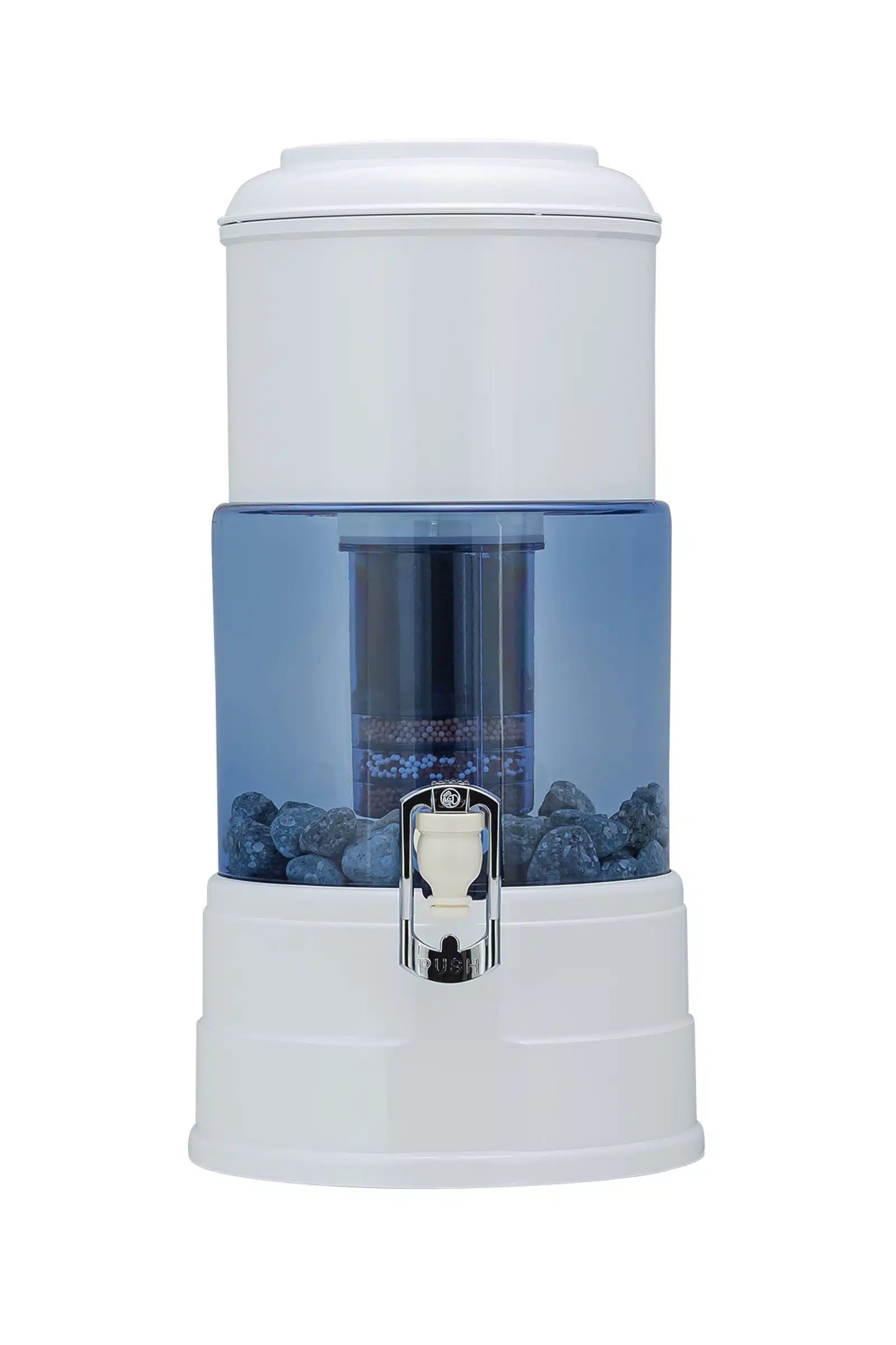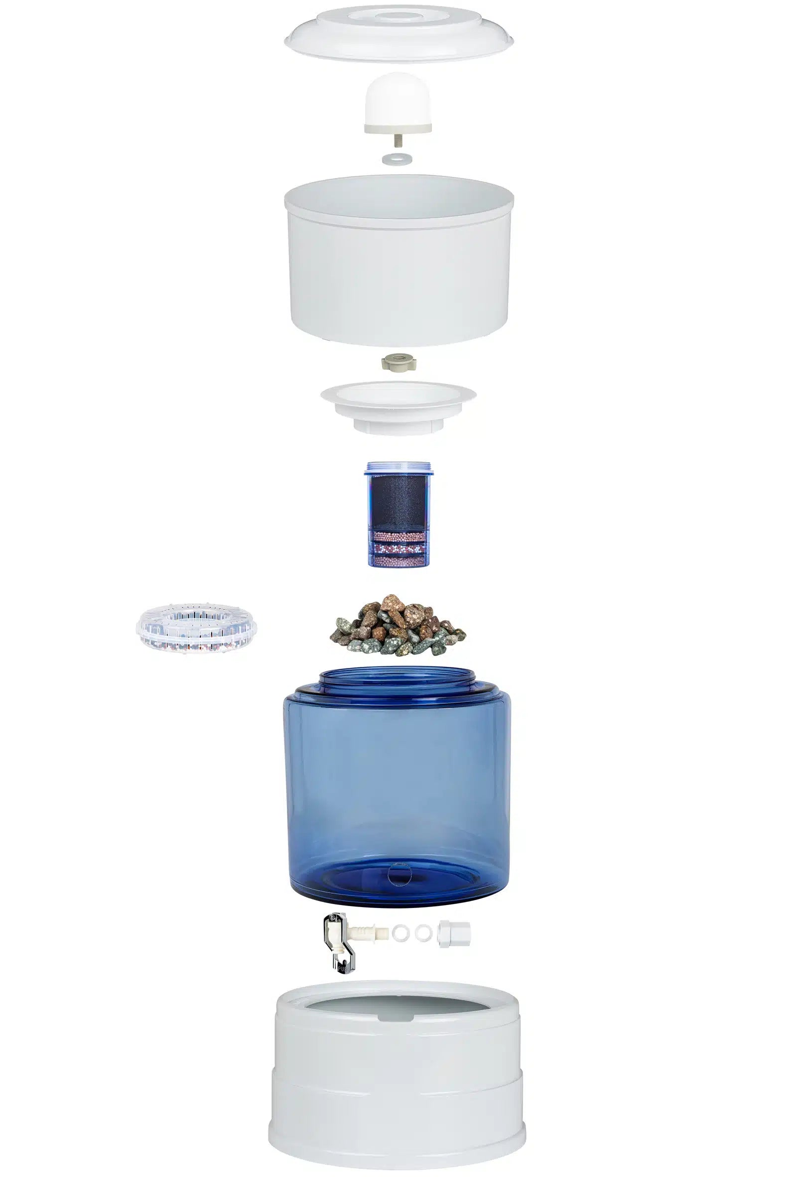 In the upper tank, you pour unfiltered water, which is slowly filtered and then flows into the lower storage tank. Make sure not to add more water than the storage tank’s capacity allows.