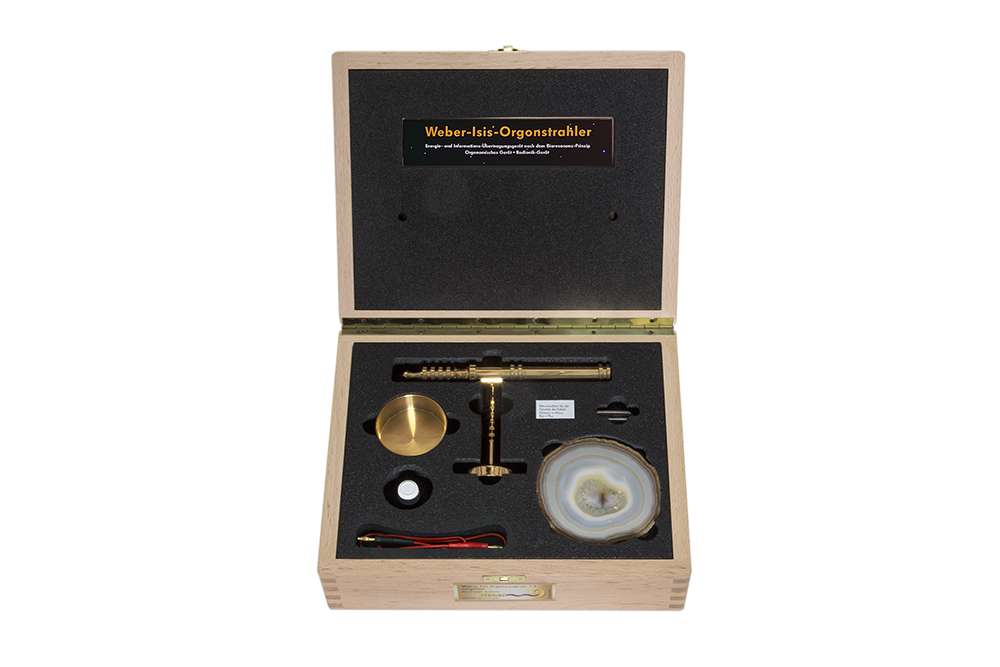 Weber-Isis® Orgone Radiation 1:1 basic set in beech wood box, suitable for natural doctors, alternative practitioners and self-users. Consisting of: Weber-Isis® Orgon Radiation 1:1, 1 pc. Isis transmitter cup 1:1, 1 pc. Isis-cable 0,5m, 1 pc. Isis agate disc, 1 pc. Isis astro picture, 1 pc. Isis-transmitter ampoule 1:1 H, 1 pc. Isis mountain crystal 1:1, incl. an instruction booklet. All brass parts are :gold-plated.